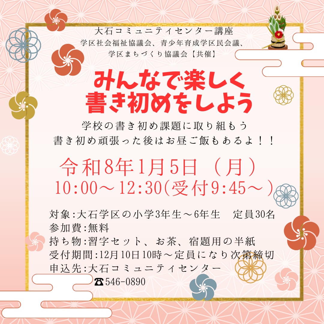 貸館に関するお問い合わせは、大石コミュニティセンター546-0890まで